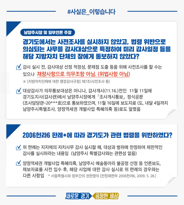 이어 "남양주시가 경기도의 적법한 감사를 거부하고 있으며 일부 언론 및 인터넷에서는 사실관계를 왜곡하거나 도를 넘은 비방을 하고 있다"며 구체적 사실을 들어 반박했다.