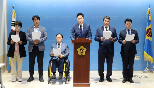 이날 TF 소속 오석규, 박재용, 이인규, 조성환, 고은정, 명재성 의원은 도의회 3층 브리핑룸에서 142명 의원이 서명한 '경기북부특별자치도 추진 특위 구성 결의안을 상정도 하지 않은 운영위원회는 각성하라'라는 제목의 기자회견문을 발표했다.