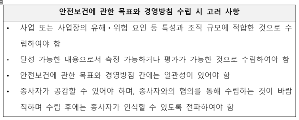 따라서, 안전보건 경영방침과 목표에는 ▲기업이 영위하는 사업의 특성과 각 사업장의 실질적인 유해·위험요인을 반영하여야 하고 ▲이를 개선하기 위해 측정 및 달성 가능한 구체적인 목표가 포함되어야 한다. 또 ▲ 종사자들이 이를 인식하고 실천하도록 하도록 전파함으로써 사업장의 위험요인 제거에 기여해야 한다. 즉, 안전보건 경영방침과 목표 수립 시 아래와 같은 사항이 고려돼야 할 것으로 보인다.