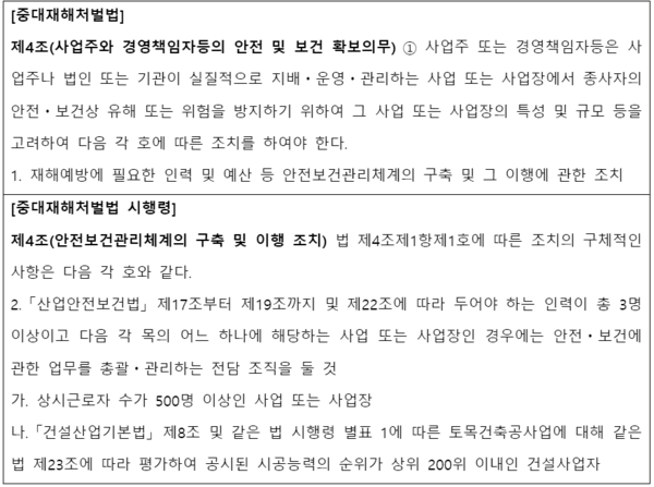 구체적으로 중대재해처벌법 제4조 제1항 제1호는 재해예방을 위하여 필요한 인력과 예산을 확보하고 안전보건관리체계를 구축·이행할 것을 의무화하고 있다. 이에 따라 같은 법 시행령 제4조 제2호는 안전관리자·보건관리자·산업보건의 등 법정 인력이 3명 이상인 경우에 더해 상시 근로자가 500명을 초과하거나 '건설산업기본법'에 따른 시공능력 평가 순위가 상위 200위 이내인 건설사업자인 경우에는 안전보건 전담조직을 반드시 설치하도록 규정하고 있다.
