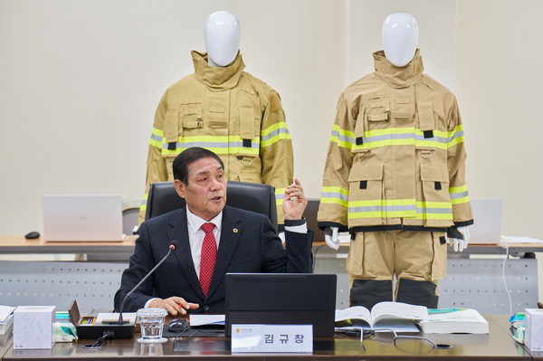 김규창 경기도부의장이 최근 경기도 소방재난본부에 대한 2025년 경기도 행정사무감사 안전행정위원회 현장감사에서 화재 현장 최일선에서 근무하는 소방대원들의 안전 확보를 위해 고성능 신소재 방화복의 조속한 지급을 강력히 촉구했다.